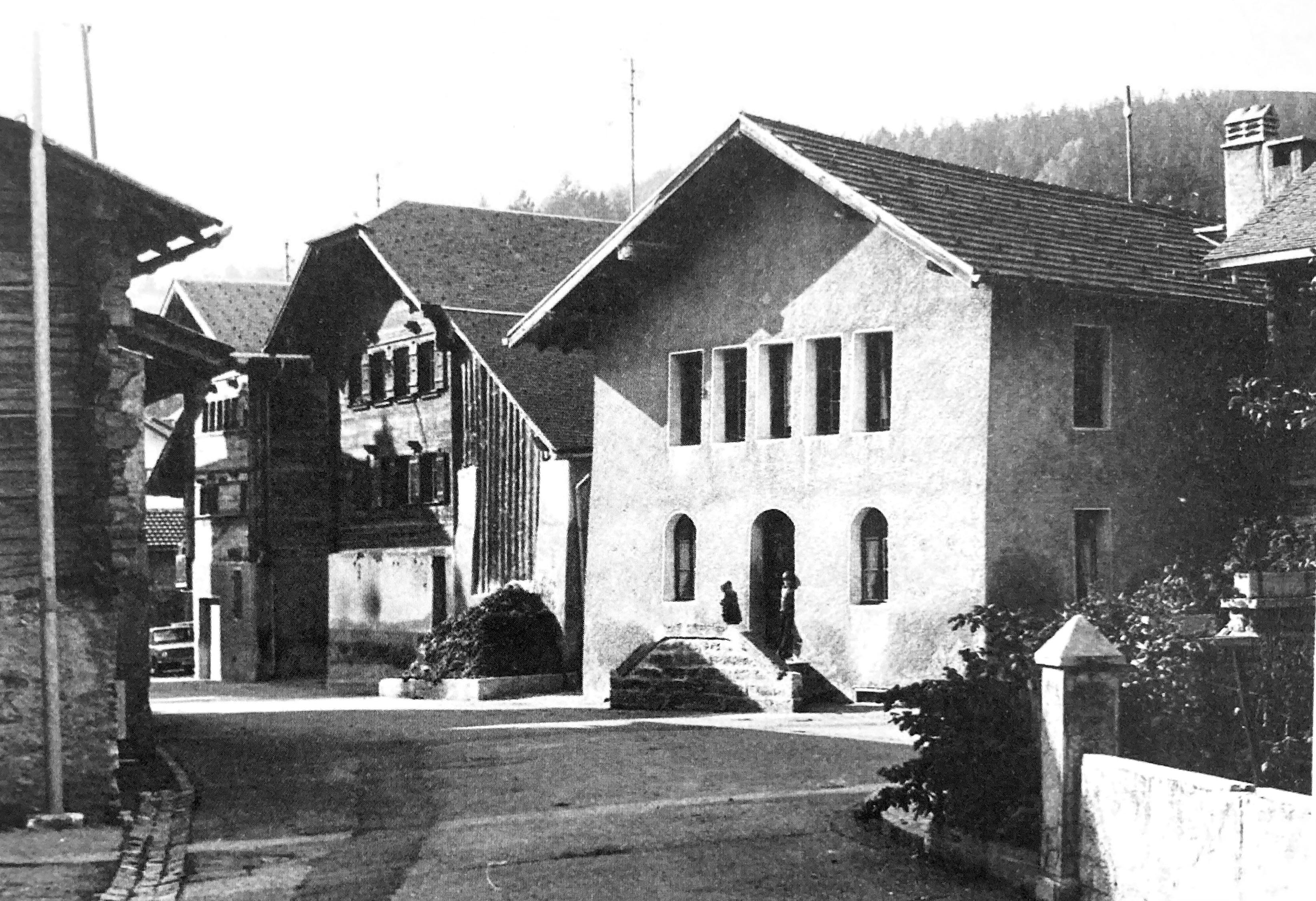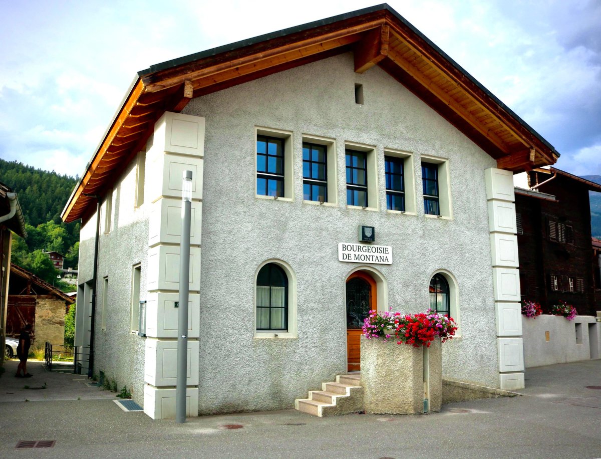 MONTANA-VILLAGECette bâtisse est en possession de la Bourgeoisie depuis 1634 et a été rénovée une première fois en 1924. Elle abritait une ou deux salles de classe, à l’étage on trouvait le bureau de l’Etat Civil, le cachot au rez-de-chaussée et au sous-sol, la cave de la laiterie ainsi que la cave bourgeoisiale (qui devient plus tard le carnotzet).